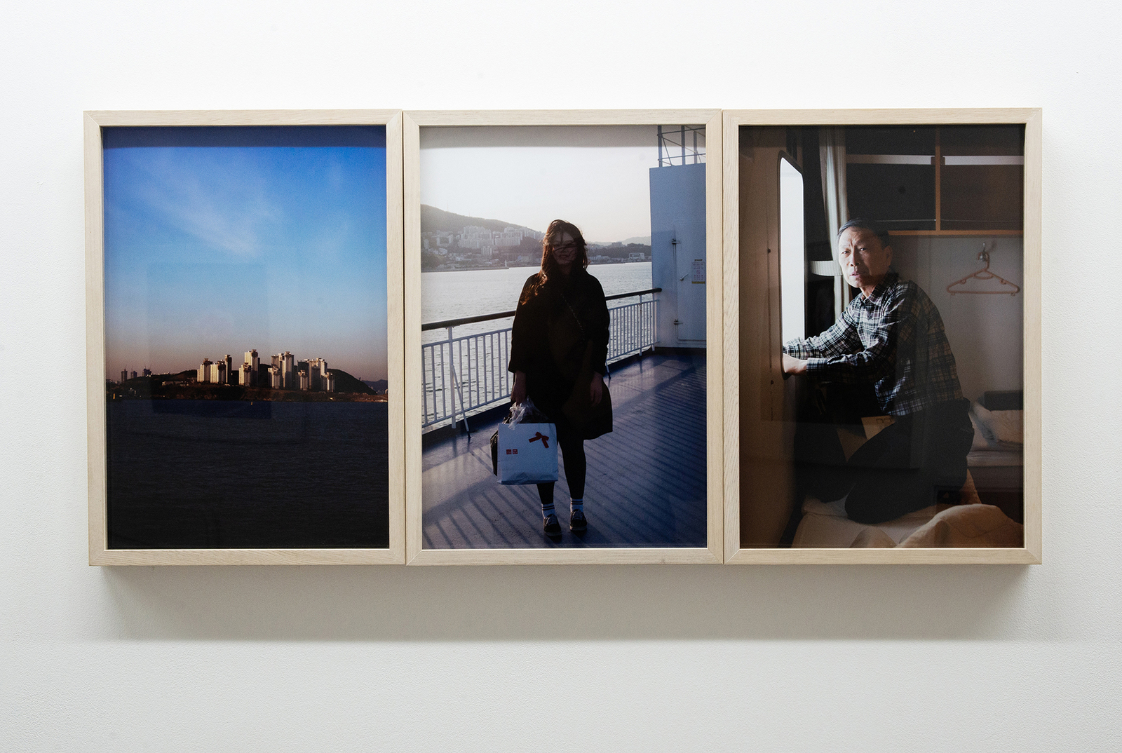 とりわけ印象に残った一連の写真がある。一枚目には海上に浮かぶ島が写っている。二枚目は船のデッキに立つ若い女性の写真。逆光で顔はよく見えず、手に持ったユニクロの紙袋の赤が映える。三枚目は船内で窓際に腰かける白髪の男性をとらえたもの。うっすらと浮かべた笑みには、人生のあらゆるものが反映されているかのような静かな深みがある。理屈はわからない。だがこれらの写真を見ると、その人たちとその世界にひきつけられずにはいられない。見なおし、さらにもう一度見たうえで、展示全体をあらためてひとめぐりすると、人と世界を愛おしく感じずにはいられなくなる。